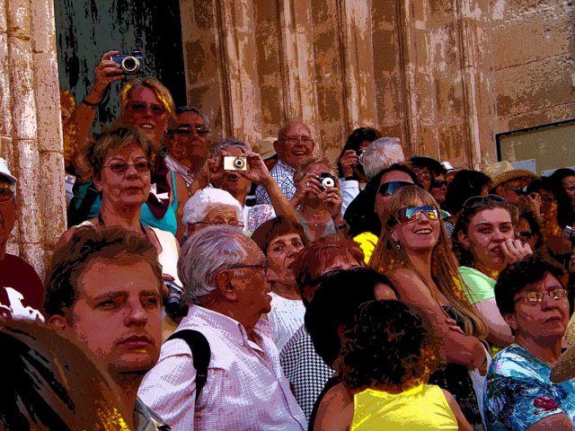 Supòs que per pal·liar un poc l'enyor, una amiga m'ha dit de fer un sopar al jardí de casa seua el dissabte de Sant Joan. Torrarem costelles, em va dir. Duré una sobrassada li vaig contestar. Em queda un terç de Xoriguer, va dir. Comprarem Kas de llimona, com a la cançó d'Antònia Font. Abans, però, esperaré la telefonada del meu pare, perquè quan sigui dalt de tot de les escales de la Catedral per veure entrar els cavalls al born (mirau la foto) em digui com ha anat el replec... Que petit que és el meu Sant Joan! i que molt que l'enyor quan no hi som.