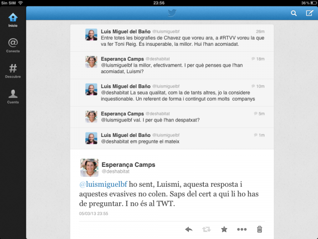 Els directius culpables, els que tot ho silencien, van considerar que no són dignes de continuar a Canal 9, però bé que s’han aprofitat del seu treball fins i tot quan ja no eren a la casa. El més patètic d’això ho trobareu a la fotografia que encapçala aquest post. Pràcticament a la mateixa hora que s’emetia la biografia de nevera feta per Toni Reig, Luis Miguel del Baño, director dels informatius del cap de setmana, que no és fix d’oposició i que es permet escriure reportatges sobre els afectats pels ERO amb nom simulat, (Luis és el seu primer nom i Fernández el seu segon cognom) a la revista XL Semanal, i que s’ha salvat de l’ERO, llançava un twit lloant la feina del company acomiadat. Innocentment li vaig preguntar quins pensa que són els motius que han dut els directius de l’empresa a tirar a Toni... Bé. la seqüència la podeu llegir vosaltres mateixos.