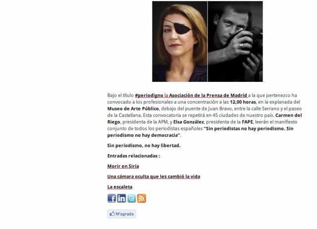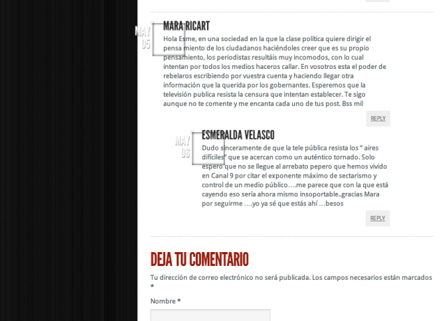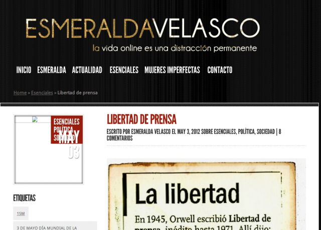 No s’oblide, senyora Velasco de fer una cosa molt important avui en dia: pel que més vullga esborre les seues petjades digitals. Supose que una dona com vostè que viu la via online com una “distracción permanente” sabrà de què li parle. Sí, és clar, m’estic referint a aquesta cosa tan xula i tan guai que és un portar blog on pots amollar tot el que et sembla que està bé, fins i tot, escrius amb una certa gràcia tot el que penses. Vostè ho fa molt bé: la seua bitàcola té un disseny molt ben aconseguit, és molt personal i porta la seua marca. Parla de dones imperfectes, se solidaritza amb les víctimes de la violència de gènere, la política internacional li encanta, és clar, les guerres televisades que no són guerres ni res, defensa la marca Espanya i, fins i tot, es permet el puntet de progressia, perquè cal arribar a tots els públics, de dir que Urdangarin és un... Ah, i com que una (vostè) és periodista i ha donat les notícies a una cadena privada de televisió i durant una època en va ser la cara més visible, queda molt bé clavar-se amb les línies informatives de les teles públiques. És clar, la imparcialitat i la llibertat d’expressió, això és una passada, que per això tu escrius el que vols, que el blog és teu, no? Mane qui mane, tu et claves amb qui siga i així quedes com una reina. Mira, Urdaci, fatal perquè va dir allò de cécéoo. I Canal nou, por Dios, “solo espero que no se llegue al arrebato pepero que hemos vivido en Canal 9 por citar el exponente máximo de sectarismo y control de un medio público... me parece que con la que está cayendo eso sería ahora mismo insoportable...”