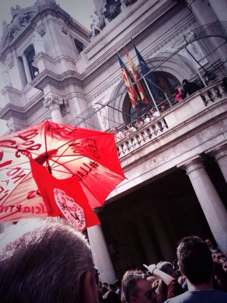 El "roig jupetí" que és tendència i que queda tan bé a les fotos quan el llueixen aquest grup incansable de companys que han fet visible la nostra reivindicació. Anit també eren a Burjassot, sostenint el salvavides perquè els membres del comitè d'empresa no s'ofegassin de dolor després de signar aquest ERO. El segon ERO.