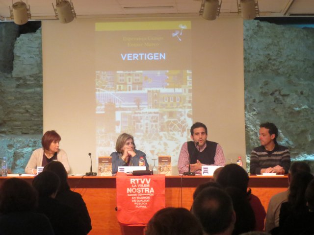 Uff. Toca respirar fondo. L'editor dóna les gràcies. Traus una llibreta i un boli i uns papers i no saps què fer amb tot això. Hi ha un focus que t'enlluerna. Mires al fons. Encara entra algú. Fotos. Piulades. Sergi Pitarch diu realitat i diu ficció. I us fa preguntes. Aneu dient. Veus la teua filla que fa les fotos que després penjaràs al Facebook i al blog. Hi ha somriures còmplices. Hi ha riallades obertes. Hi ha aplaudiments. Hi ha preguntes del públic. Hi ha emoció. Més vegades emoció. Agraïment infinit als asistents. I s'acosten els amics perquè els signeu els llibres. És un comboi, un més, passar-nos els llibres per signar totes dues. Més agraïment i més infinit encara. Penses que de tota la desfeta has tret algunes coses bones i una d'elles és conèixer persones increibles amb qui et creuaves pels passadissos i no us deieu res. Has descobert la cara humana de la gent. Quin regal. També has escrit una novel·la a quatre mans. Fa mig any ni somniaves que ho faries i ara està publicada en una editorial que neix. S'acaben les signatures i els companys de Mil de Nou us fan una entrevista. Amb dues càmeres! La tertúlia no s'acaba mai. Gintònic i cerveses al Sant Jaume. Confidències. Riures i somriures. Una passejada per la ruta #Vertigen d'Empar. Observació de les torrasses de Palau. Cauen quatre gotes. Busqueu un lloc per picar alguna cosa. Més confidències. Conversa relaxada. Que bé! L'enyoraves, aquest moment. La torrija de fartó i orxata no està gaire aconseguida, però rieu mentre al carrer la pluja s'agafa. I quan acabeu us deixeu banyar. No hi ha pressa per a parar un taxi. A aquestes hores el #vertigen el deixeu per al llibre. Ara toca tornar a quadrar agendes i calendaris i preparar la presentació de dilluns a Barcelona.