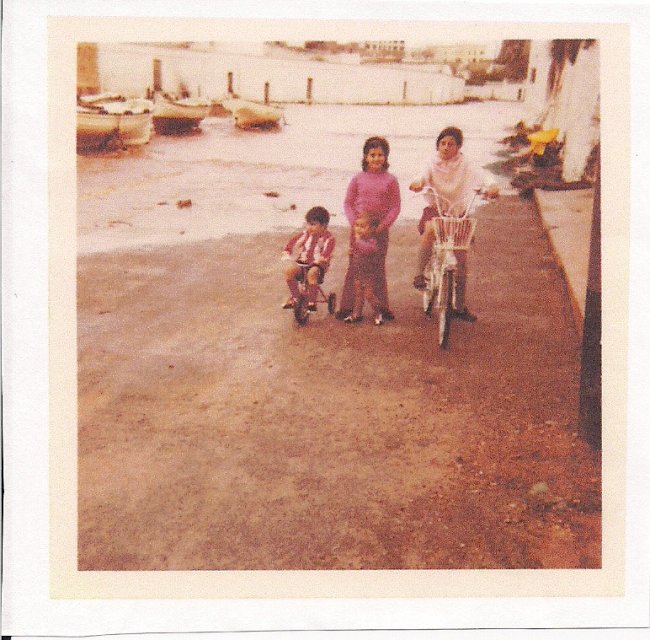 No crec que s'enfadin els personatges que hi surten. Els demàn perdó d'avançada, però tenc ganes de contar qui són. La de la dreta és la meua tia Mari, amb la bici nova i el "poncho" que li havien deixat els reis (a mi també m'en van dur una, més petita, però es veu que en el moment de la foto estava aparcada) Els dos petits són els meus cosins: Nasi ( el del velocípio) i Martí (el que jo agaf). Darrere nosaltres, l'aigua de pluja que s'ajunta amb la mar de sa colàrsega del port després de baixar amb força del canal.