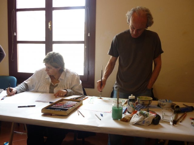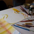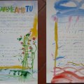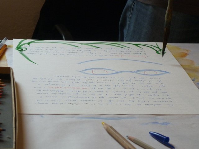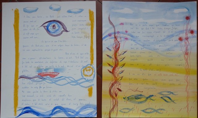 El talent d’en Mikel va fer que, amb colors alegres, amb aqualrel·les aparentment naïfs plenes de floretes i de peixets, deixés plasmada la seua lectura. Ell no dóna importància a la feina que fa. A mi m’impressiona. Em feia l’efecte que jugava amb els pinzells, els tubs d’acrílic, els llàpissos de colors... tot el temps em demanava si m’agradava el resultat de la seua intervenció. He de confessar que al principi em va costar entrar en el joc, però quan ja duem un parell de pàgines em vaig amollar i jo procurava escriure el text creant formes o deixant els espais que ell em demanava per omplir-los de color.