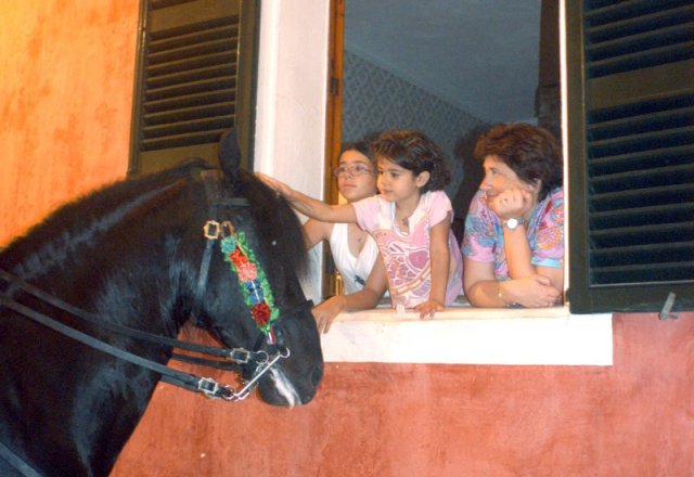 Aquesta foto té cinc anys. És del dia de Sant Joan del 2004. Els cavalls van cap al caragol de Santa Clara. Les filles i jo som a una finestra privilegiada, la dels nostres concos. En Jesús era baix, intentant fer bones fotos dels cavalls fent entra en algunes cases, de les capadetes a les finestres, de les persones que passen cap als carrers on es farà el darrer caragol del darrer dia de la festa. I entre totes instantànies, que ara es diuen imatges, ens va fer la que encapçala aquest post. M’agrada molt. Els anys passats no li han fet perdre el seu poder evocador. Podria escriure el que pensava en el moment del dispar, que ara es diu click. La foto no està dins cap capsa de llauna. És al disc dur de l’ordinador d’en Jesús i a algun DVD que per seguretat s’ha fet, i encara a un altre disc dur extern. Tres o quatre còpies per assegurar un document intangible que no sabem fins a quan serà útil o visible o manipulable. Moltes de les fotos de dins les capses de llauna de casa tenen més de quaranta anys. I allà són. En paper. Sense haver rebut més cura que la d’evitar de posar-hi massa els dits damunt o la de procurar que estiguin a un lloc sec i no gaire calent. On seran d’aquí a quaranta anys aquesta foto, més els milions de fotos que es faran aquest Sant Joan?