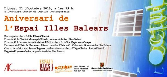 Jo des d'aquí us convid a participar de la festa. La festa de l'Espai Illes Balears, i de la presentació a València de l'Institut Menorquí d'Estudis, d'escolta música feta a Mallorca i de tastar algunes joies de la nostra gastgronomia. És un bon pla per un dijous a capvespre-horabaixa-tarda, no?