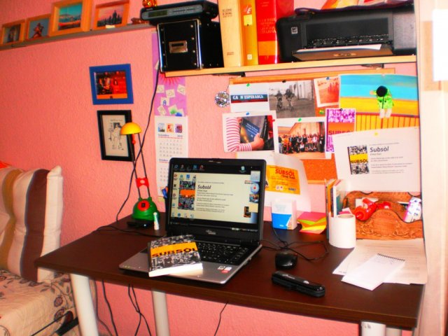 No faré un repàs d'aquests dos anys, ni miraré estadístiques. Només diré gràcies. En tot cas, a través de la casa virtual obr una finestra al racó des d'on ara estic escrivint aquestes paraules d'agraïment. La foto no és molt bona. Està feta amb una camereta petita, compacta, amb un programa que es diu pop-art que exagera els colors... ho dic perquè el rosa de les parets no és així d'intens...