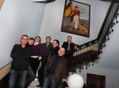 De totes les fotos que ens va fer en Jesús anit a Sueca, he triat aquesta. Tots els Unais enfilats a l'escala de la biblioteca suecana, presidits per una senyora República, i rient a cor que vols. Unai Siset és així. Així solen començar i acabar les nostres reunions. Ahir vam presentar el llibre a Sueca, a la biblioteca suecana que està just al costat de la casa de Joan Fuster, que al mateix temps està just al costat de la casa de Manuel Baixauli. Ell conta que escoltava la màquina d'escriure de Fuster, i és clar... El lloc imposava, al bloc de Subsòl podeu veure més fotos, però l'ambient va esdevenir càlid i acollidor. Com per art de màgia. Totes aquelles persones omplien l'espai amb ganes de saludar el seu veí Manuel, i amb curiositat per sebre qui era la "gentola" amb qui s'havia ajuntat per a perpetrar aquest artefacte que és un llibre de relats escrit a tantes mans i tants cervells.